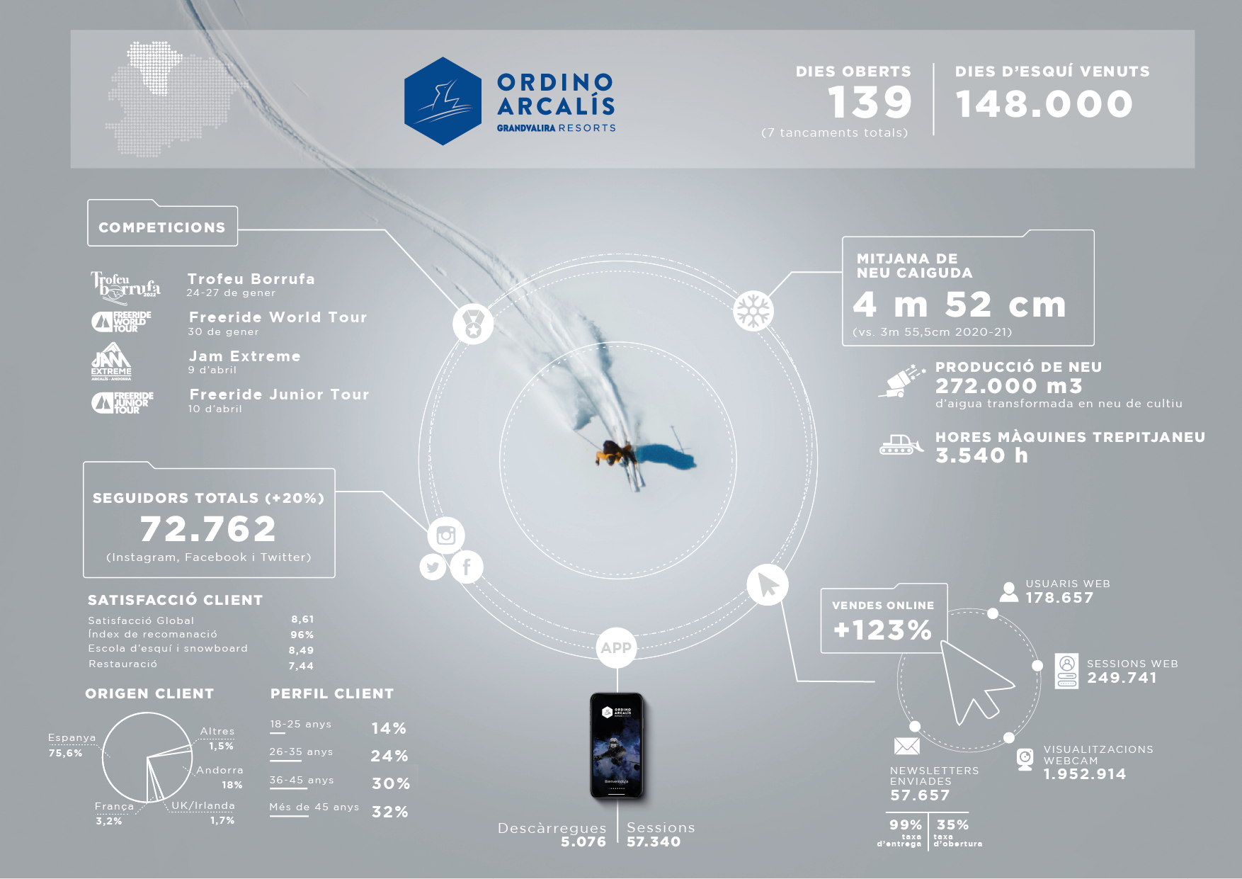 En l’augment d’ingressos també ha tingut un gran impacte la nova estratègia de preus dinàmics implementada per Grandvalira Resorts aquesta temporada, que ha potenciat els canals online propis de l’estació premiant la reserva anticipada amb descomptes. Com a conseqüència, les vendes als webs i a les aplicacions han augmentat un 137%, en el cas de Grandvalira, i un 123%, en el d’Ordino Arcalís, respecte a la temporada 2018-19. La mateixa línia de creixement s’ha produït en les compres del Forfet Plus+ i el Forfet de Temporada, que han augmentat un 110% i 11%, respectivament.