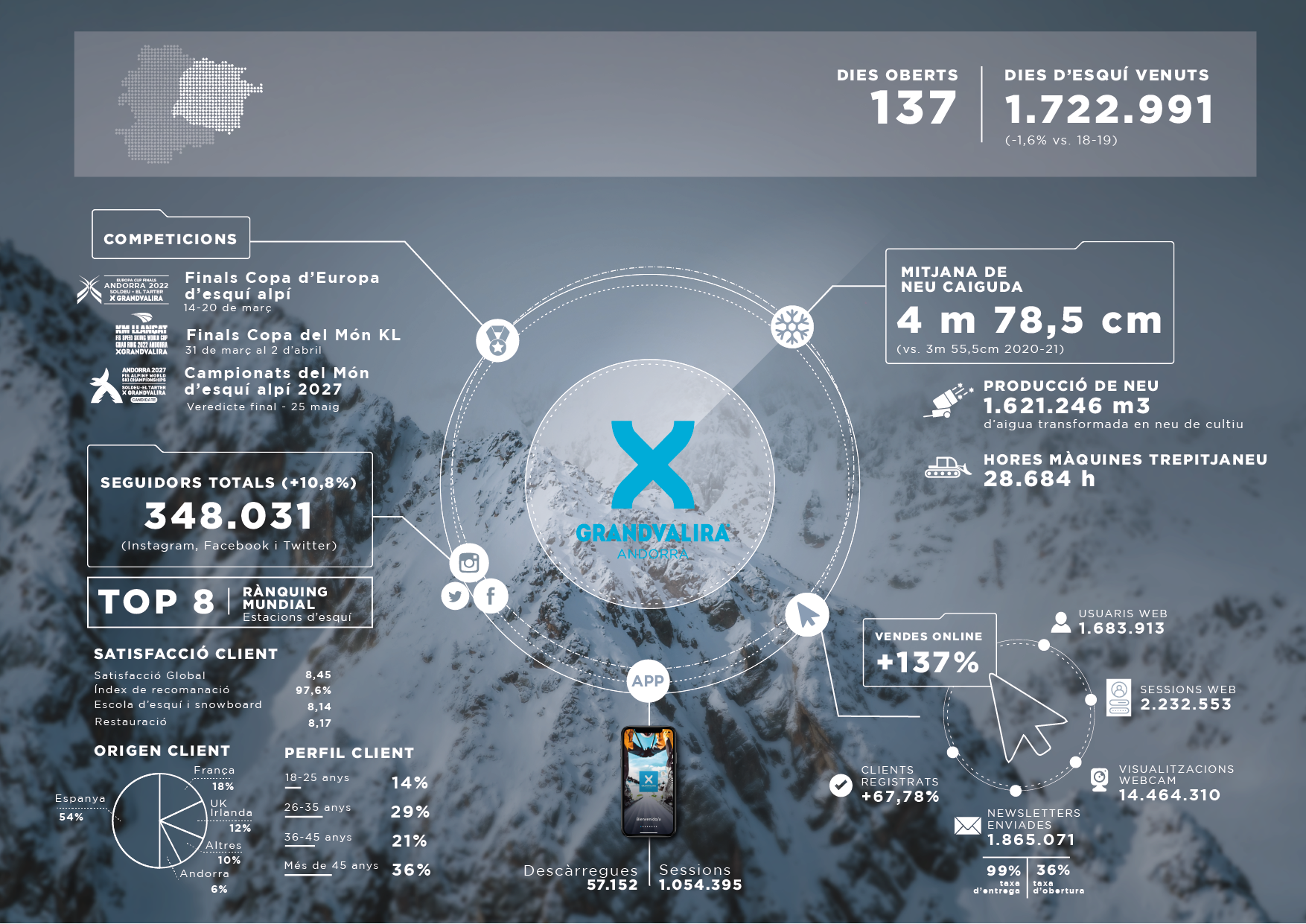 Aquesta petita davalla s’ha pogut compensar amb “una millora del perfil mitjà del client”. Això ha permès que s’hagin incrementat la despesa mitjana per visitant. Pel que fa a l’origen dels esquiadors, des del domini es valora positivament els mercats de proximitat, amb increments dels provinents de França (+8%) o de la zona centre d’Espanya (+6%). Això ha ajudat a minimitzar els efectes que la pandèmia encara ha tingut en altres mercats tradicionals, més llunyans.