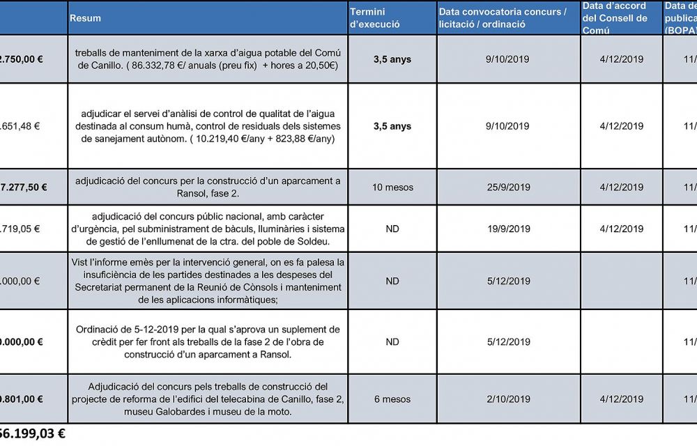 Objectiu Comú es mostra “sorprès” i “gairebé indignat” amb el fet que en la darrera sessió comunal, el 4 de desembre, s’acordessin tot un seguit de noves adjudicacions -com ara la construcció d’un nou aparcament a Ransol o la remodelació de l’edifici del telecabina amb l’objectiu que pugui acollir el Museu de la Moto o el Museu Galobardes- que suposen una despesa global d’uns 4.800.000 euros que van més enllà, òbviament, d’aquest 2019. Si aquests diners “s’hi sumen les recents adjudicacions dels ponts tibetans, per un valor de 2.600.000 euros, tot plegat suma gairebé 7,5 milions” que comportaran que “la capacitat d’inversió, el proper mandat, s’haurà minvat a l’extrem o serà nul·la”.