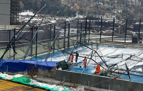 Part de la tanca lateral que protegirà l’espai perquè les pilotes no surtin cap a l’exterior, ha quedat totalment doblegada a causa del pes de la neu que ha fet ensorrar la xarxa del sostre. Amb tot, no s’han hagut de lamentar danys personals ni s’ha fet malbé cap més part de les pistes.