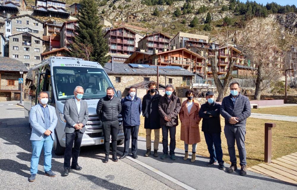 El vehicle d'Andbus que farà la prova pilot, al costat de l'església de Sant Pere del Tarter.
