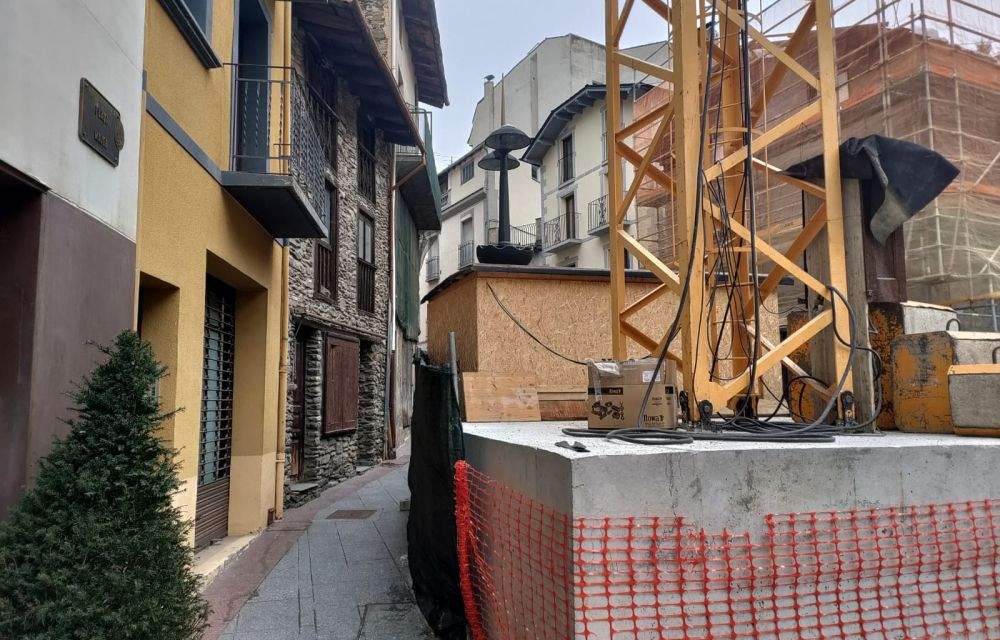La grua forma part dels treballs d'una construcció que s'està rehabilitant a la plaça Major. És l'edifici que havia acollir el servei de Correos, abans del seu trasllat a l'altre costat de la plaça, juntament amb la Poste.