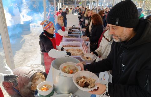 Cua de ciutadans esperant el repartiment de l'escudella.