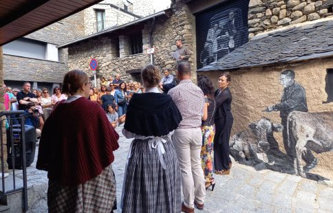 Entre elles, hi ha la representació d’aquests encampadans il·lustres. També, però, altres escenes de la vida quotidiana al poble. És el cas d’un ball de festa major o del treball als orris amb les ovelles. La pintura de benvinguda, de fet, és obra dels adolescents del casal de joves, que han col·laborat amb Bosque en un el que ha estat un repte important. L’artista ha explicat que hi ha treballat durant dos mesos i mig i que, a més, ha hagut d’afrontar el dibuixar sobre superfícies, com ara metall, que li eren noves.