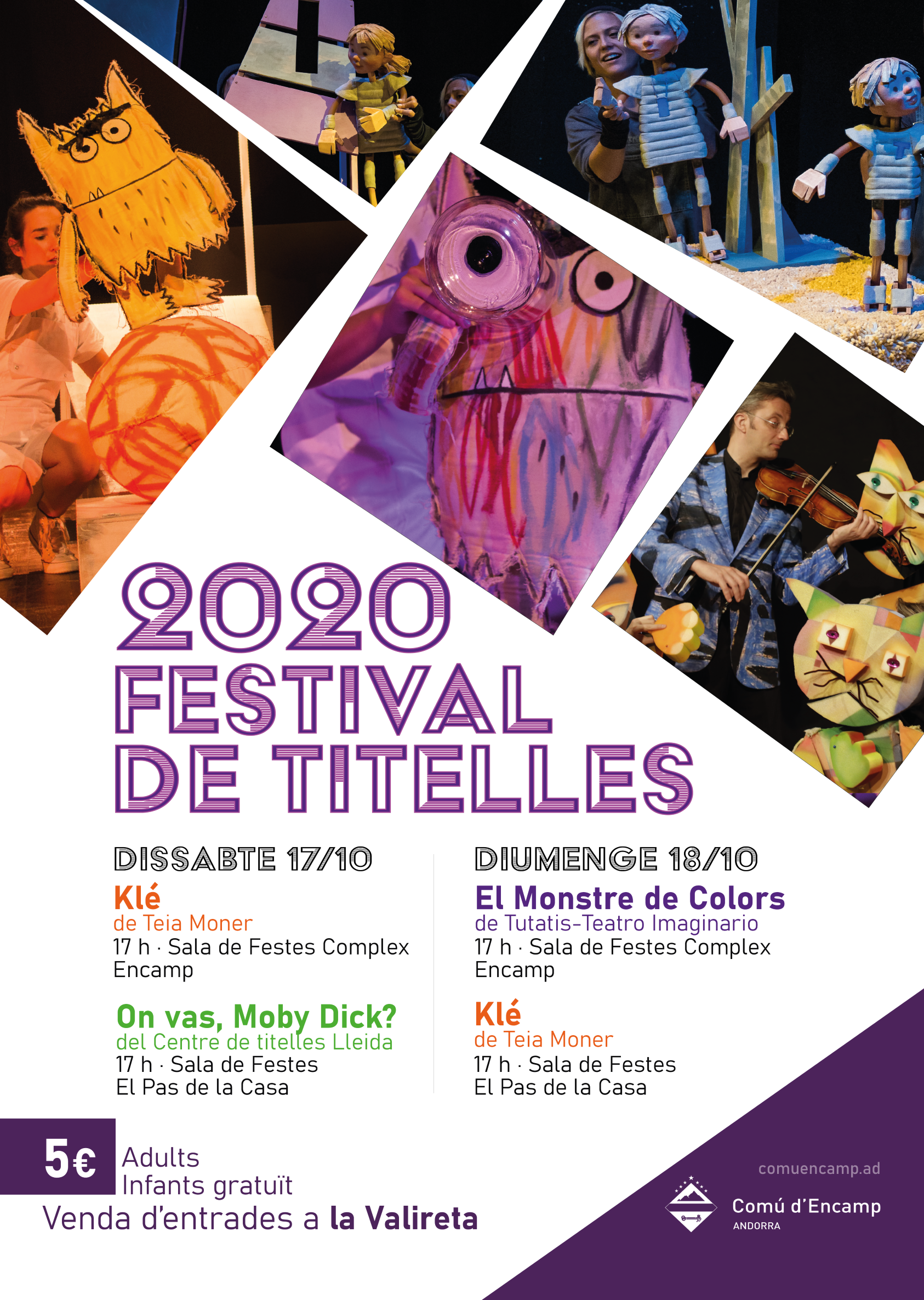 El festival es manté adaptant-se, doncs, a les mesures sanitàries establertes per intentar frenar l’expansió del coronavirus. El tret de sortida el donaran els espectacles ‘Klé’ de Teia Moner, que es farà a la sala de festes del Complex d'Encamp i ‘On vas, Moby Dick?’, del Centre de Titelles de Lleida, a la sala de festes del Pas de la Casa. Tots dos seran el dissabte a les cinc de la tarda. Diumenge, es representaran les obres ‘El Monstre de Colors’ de la companyia Tutatis - Teatro imaginario a Encamp i, de nou, ‘Kle’, al Pas.