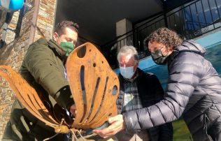 El conseller de Medi Ambient, Sergi Gueimonde, i el representant del Quart, Amadeu Gelabert, han estat els encarregats de rebre l’obra cedida per l’artesà de la forja, que a partir d’ara es podrà veure al mig del poble d’Arinsal.