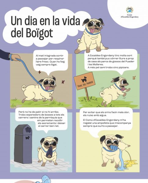 En aquesta es recorda la necessitat de recollir i retirar els excrements de l’animal i netejar la part de la via o del mobiliari públic. Per garantir que els carrers estiguin nets, el comú posa a l’abast de la ciutadania expenedors de bosses de plàstic. En la mateixa línia, la campanya també incideix en el fet que els gossos poden córrer lliurement als parcs del Puader i de les Molleres i de la disposició de cinc pipicans ubicats en diferents punts de la parròquia (Falgueró, Parnal, Til·lari, Puader i Molleres).