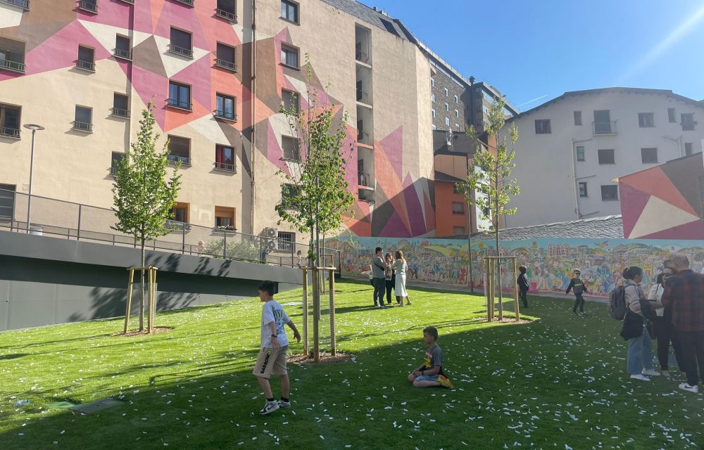 La cònsol n’ha llistat els atributs: un aparcament soterrat d’un centenar de places, els 1.000 metres quadrats de plaça oberta (amb un bon espai verd i una zona per a vianants que l’envolta) i el mural de grans dimensions creat per la il·lustradora catalana Pilarín Bayés, una obra de gairebé trenta metres de llargària i dos metres d’alçada que ofereix “un recorregut ric i amè per la geografia, la cultura i les tradicions” de la parròquia. Aviat, ha ampliat la cònsol, “també hi haurà taules”. “Estem pendents de poder habilitat, ben pròximament, dos espais de convivència, és a dir, un bar, un restaurant… Està per definir”.