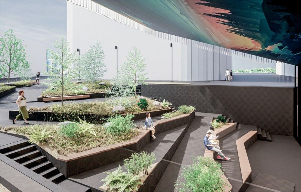 Així, per un costat, la plaça de l’avinguda Meritxell es concep com “un espai metropolità de trobada, amb vocació icònica i obert a usos culturals i audiovisuals”. Es localitzarà a l’entrada principal de l’edifici i permetrà accedir al futur Centre d’Arts Digital. Entre els elements icònics en destacarà una gran graderia situada sota una pantalla interactiva amb què es vol convertir la zona “en un espai exterior de refugi climàtic i de parada de vianants”.