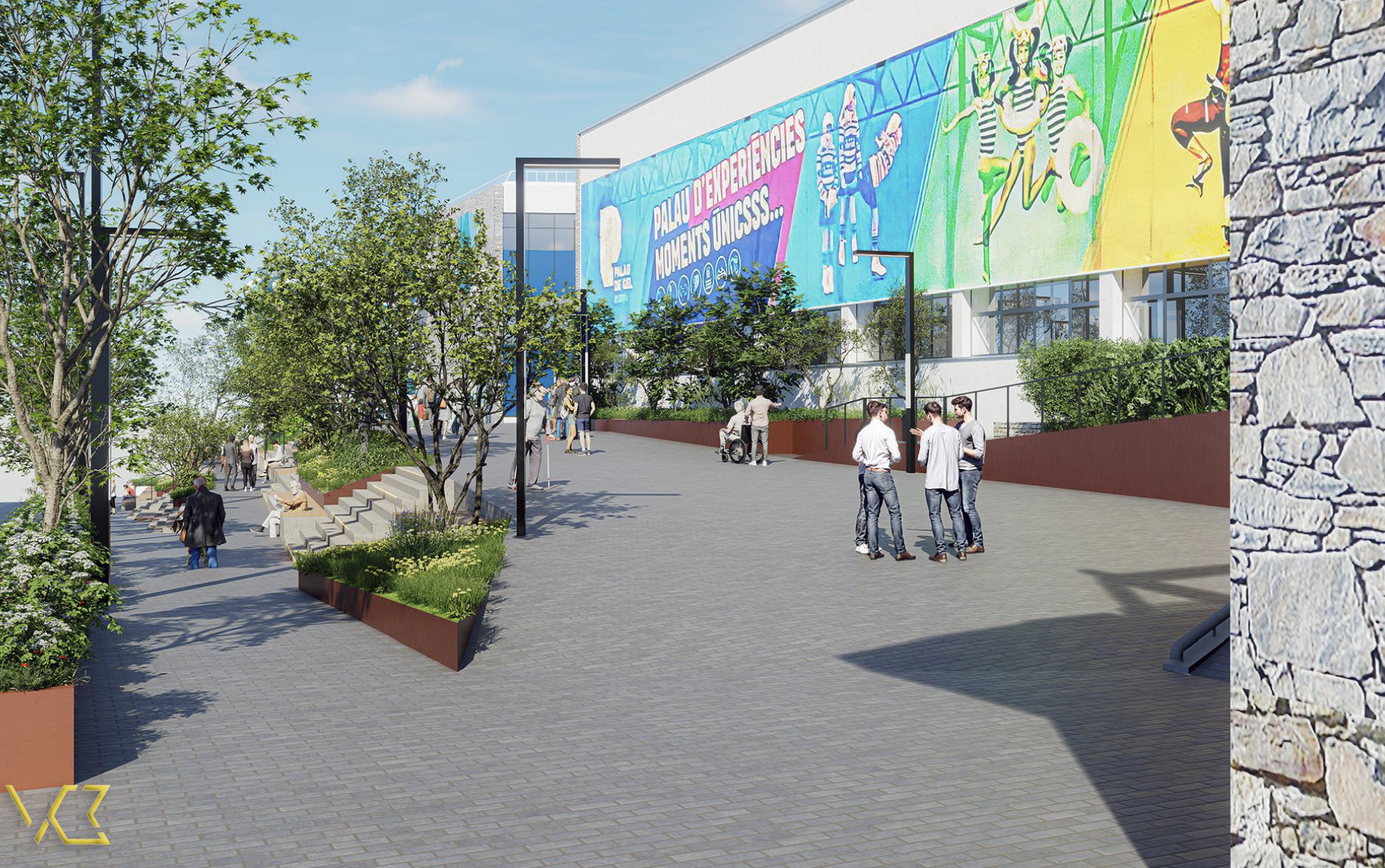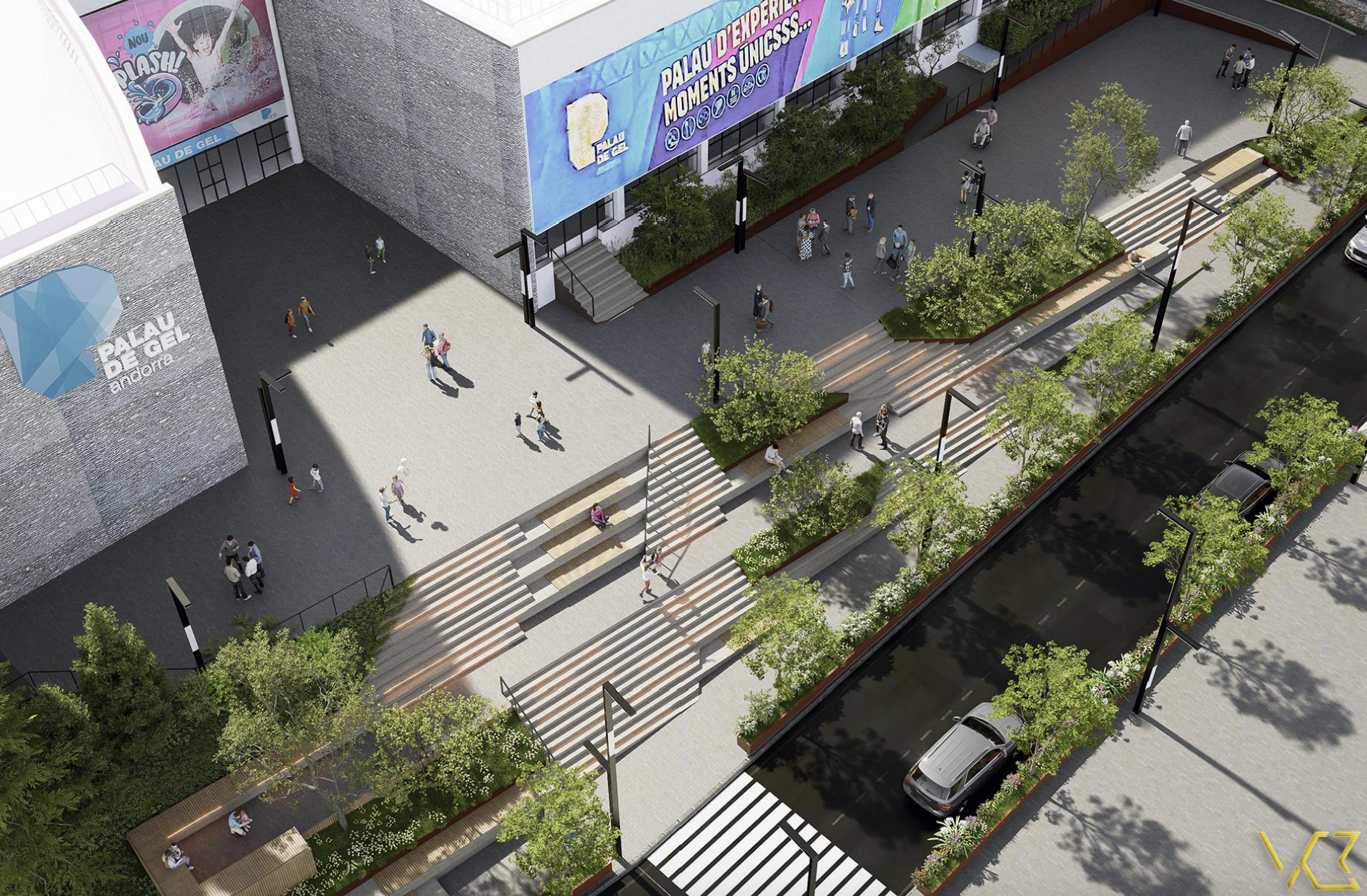 Pel que fa a la remodelació que es farà a la part davantera del Palau de Gel, l’objectiu és “crear petits ambients que convidin la gent a gaudir de l'espai, fomentant tant la seva visita com la seva permanència”. Es vol transformar la plaça en “un punt neuràlgic del poble, un lloc on la comunitat i els visitants puguin sentir-se còmodes i connectats amb la natura”. Per fer-ho, s’aposta per formigó natural i fusta i es busca que l’espai, justament, “evoqui un entorn natural”, tot creant “un lloc acollidor i vibrant per a tothom”. El projecte preveu crear escaldes amb diferents nivells i grans jardineres.