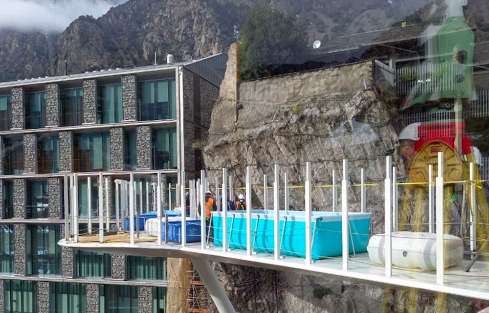 Un grup d’operaris i tècnics de diversa especialització -enginyers, topògrafs- estan realitzant les feines corresponents. S’han situat un bon nombre de piscines al llarg de la plataforma, d’una trentena de metres de longitud i quatre i mig d’amplada. Les piscines en qüestió s’han anat omplint d’aigua de manera gradual. Fins a 30.000 quilos s’hi han de col·locar. 30 tones. Això sí, en el seu equivalent amb aigua.