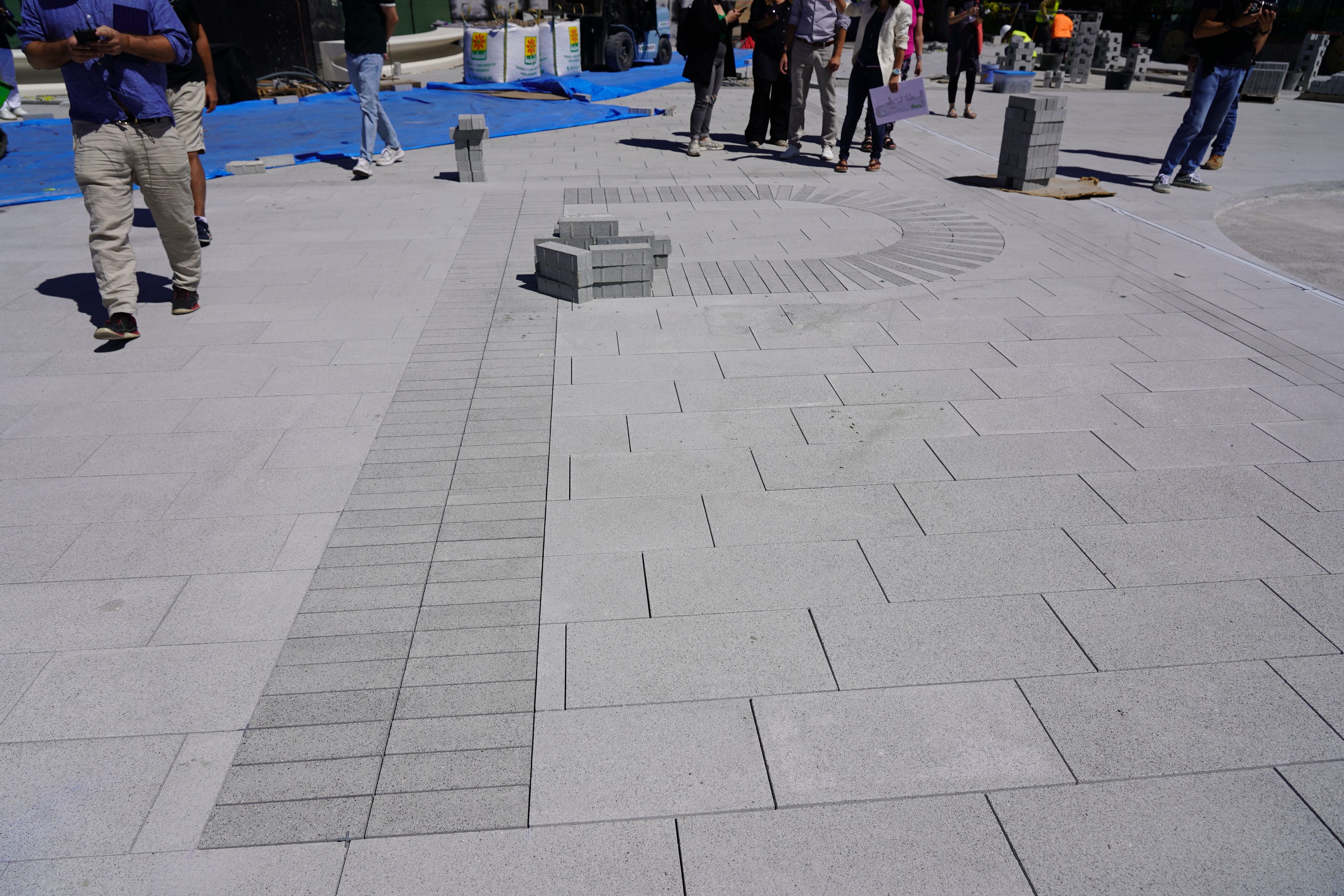 El paviment que s’ha fet servir són peces gruixudes per garantir que resisteix tots les activitats que s’hi fan, i està fet de material reciclat de les pedreres.