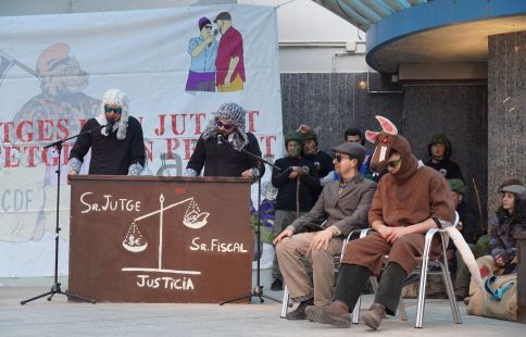 Finalment ha arribat el moment d’escoltar els arguments del cap de colla, un Sis Dits que enguany es feia dir Nicolás Maduro. La seva trista història ha tocat la fibra a fiscal i jutge i si com ha recordat l’advocat -a qui la ressaca ha passat factura fent-li oblidar el diàleg en algun moment- “el dia de Carnaval no es condemna”, sentència ràpida i al carrer. “Allà on posa presó, ho canviem per absolució!”. Ovació generalitzada i tothom cap a casa. Però abans, un bon tros de pa amb botifarra per agafar forces per una nova nit de festa fins a altes hores de la matinada.