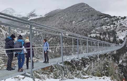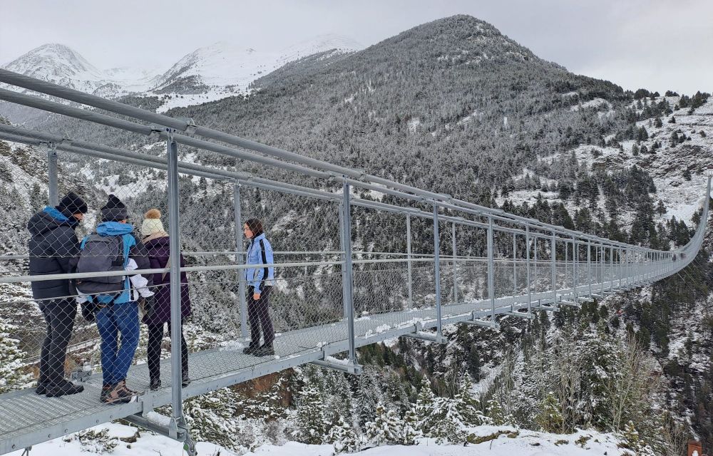 “Ara és una visita diferent”, apunta. Efectivament, el pont està envoltat d’un paisatge hivernal, ple de neu -molta de la qual caiguda la darrera nit i que ha obligat a treballar des de bon matí per deixar-ho tot a punt- i amb fred, això sí. Unes condicions que no han desanimat les persones que tenien entrada ja per aquest dia d’estrena. En poques hores ja s’han superat els dos centenars, per tant, un bon ritme.