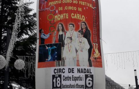 Els rètols en qüestió són genèrics de la companyia de circ. Arreu on van probablement publiciten els mateixos rètols i canvien una petita part específica on hi apareix el lloc i la data on es du a terme l’espectacle. Aquesta part que fa referència concreta a Encamp sí que està redactada en català.