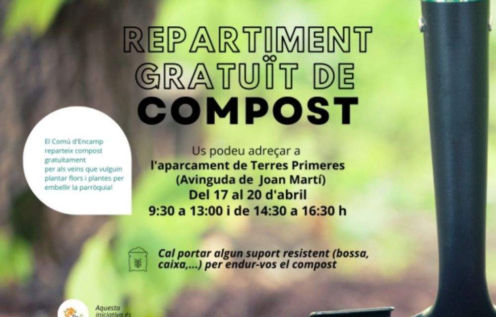 El servei de Parcs i jardins del comú d'Encamp repartirà el compost a l’aparcament de Terres Primeres, de dilluns a dijous de la setmana que ve, els dies 17, 18 , 19 i 20 d'abril, des de les 9.30h fins a les 13:30 h del matí i de les 14:30 h a les 16:30 h de la tarda. És necessari portar un recipient, sac o bossa per endur- se el compost cap a casa.