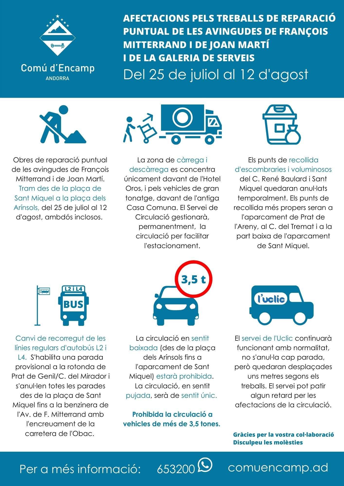 Segons s’ha informat des del comú, durant aquestes tres setmanes, la circulació només es permetrà en sentit pujada. I quedarà totalment prohibida per als vehicles de més de 3,5 tones. La zona de càrrega i descàrrega es concentrarà davant l’hotel Oros, en el cas de les furgonetes. Pels vehicles de gran tonatge, s’habilita un espai provisional davant l’edifici de serveis de l’antiga casa comuna. Per vigilar que tot es desenvolupi correctament, el comú ha decidit establir de forma permanent un agent de circulació a la zona.