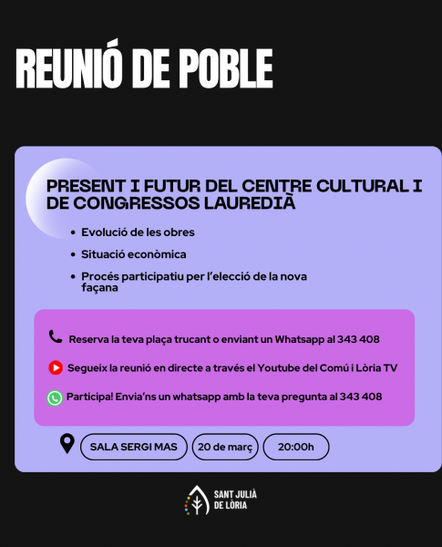 Tal i com ha informat el comú, durant la trobada es tractaran l’evolució de les obres, la situació econòmica i el procés participatiu per a l’elecció de la façana. Com que l’aforament és limitat. com s’ha dit, és imprescindible fer reserva prèvia trucant o enviant un WhatsApp al 343408. També es podrà seguir pel canal de Youtube del Comú i per Lòria TV. Tothom que vulgui fer arribar les seves preguntes pot fer-ho per correu electrònic a ciutadania@comusantjulia.ad o a través de WhatsApp al 343408 i es respondran durant la reunió.