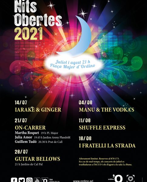 Les darreres edicions de les Nits Obertes han estat una clara aposta pel talent local amb els músics del país com a protagonistes. La proposta sorgeix per atreure el públic al carrer amb el bon temps i dinamitzar la restauració i els bars d’Ordino, que omplen les terrasses amb el públic assistent. Aquesta ha estat una de les poques activitats que es van mantenir l’any passat malgrat la pandèmia. Aquesta edició l’aforament serà limitat i caldrà fer reserva prèvia. En cas de mal temps, els concerts de juliol es traslladarien a l’ACCO i els del mes d’agost a la sala La Buna.