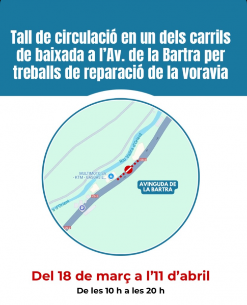 Un tram d’un dels carrils de baixada de l’avinguda de la Bartra estarà tancat fins a l’11 d’abril