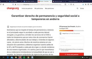 La plataforma Change.org ha publicat una petició mitjançant la qual es reclama que es garanteixin els drets dels temporers a Andorra malgrat la crisi del coronavirus. També es vol que s’asseguri que podran gaudir dels serveis de la CASS i es denuncia que hi ha casos de persones que han estat acomiadats i, fins i tot, se’ls ha fet fora del pis.