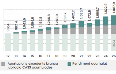Dels 1.888 milions d’euros d’actius totals que hi havia el darrer dia d’agost, 528 milions d’euros corresponen al rendiment acumulat, mentre que 447,4 són les aportacions excedents que s’han fet a la branca de jubilació de la CASS.