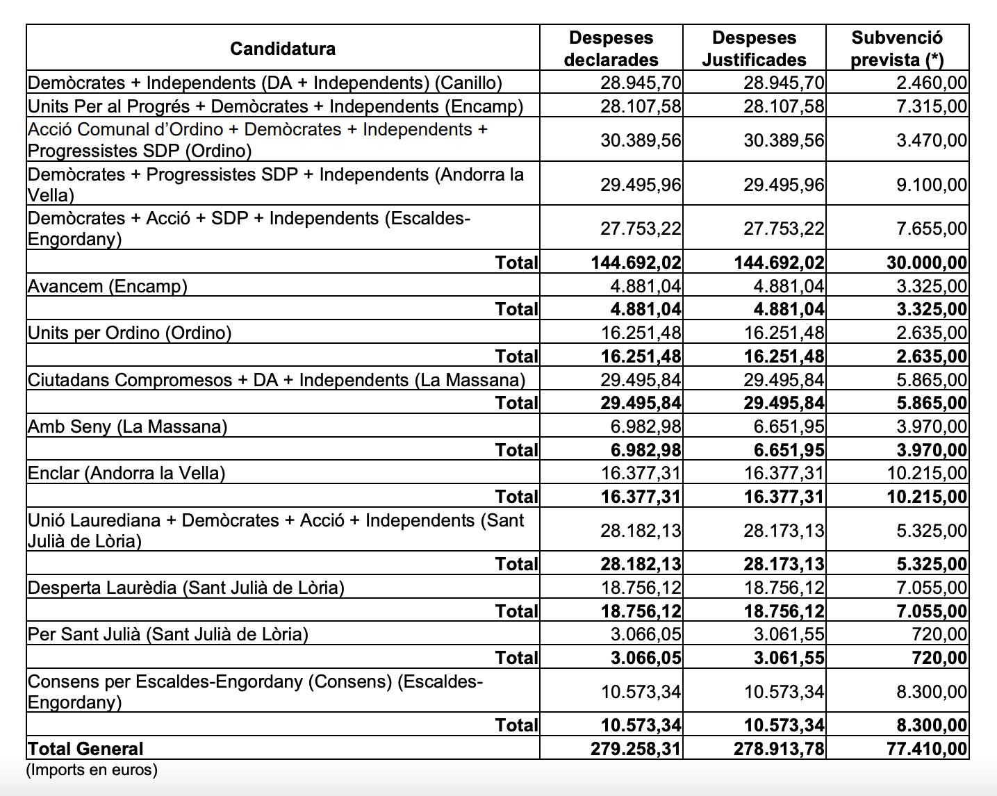 En termes de rendibilitat, ja s’ha dit, qui millor ho va fer va ser Consens per Escaldes-Engordany, la formació liderada pels qui eren i continuen sent cònsols de la parròquia escaldenca, Rosa Gili i Quim Dolsa. Les despeses electorals declarades i justificades són de 10.573,34 euros mentre la subvenció que els pertoca és de 8.300 euros, un no gens menyspreable 78%. Per cert, que la subvenció no pot se mai superior a la inversió realitzada. I els únics que no van quadrar al cèntim allò declarat del justificat, per molt poc, quedi clar, van ser Amb Seny de la Massana i dues formacions lauredianes: Unió Laurediana i Per Sant Julià. La desviació, quedi clar, és ínfima.