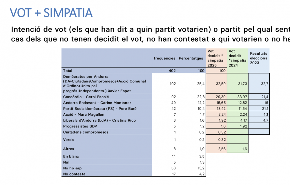 No obstant això, respecte de l’enquesta del 2024, la consulta d’aquesta primavera torna a situar els taronges per davant en intenció de vot. Els Demòcrates sumen un 32,59% tenint en compte el vot decidit i la simpatia per alguna formació. Aquest percentatge és lleugerament superior a fa un any, quan el principal partit governamental obtenia un 31,73. En canvi, Concòrdia perd força de manera sensible, tot passant del 33,97% de fa un any al 29,39% d’ara. PS (13,42%) i sobretot Andorra Endavant (15,65%) pugen en intenció de vot mentre que Acció, i especialment Liberals, SDP i Ciutadans Compromesos, a nivell nacional, es converteixen en insignificants.