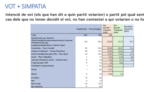 Micó ha deixat clar que amb els marges d’errors, els percentatges en intenció de vot “no són molt significatius” i amb allò amb què cal quedar-se és amb el fet que “Demòcrates estan aguantant” alhora que Concòrdia rep una mica menys de suport el 2025 respecte el 2024 malgrat que està força per sobre del suport real que va rebre a les urnes en les darreres eleccions generals, com ja s’ha apuntat. El sociòleg ha posat de manifest, també, que tant el Govern com Espot han anat perdent pistonada, encara que de forma molt moderada, després de la pandèmia.