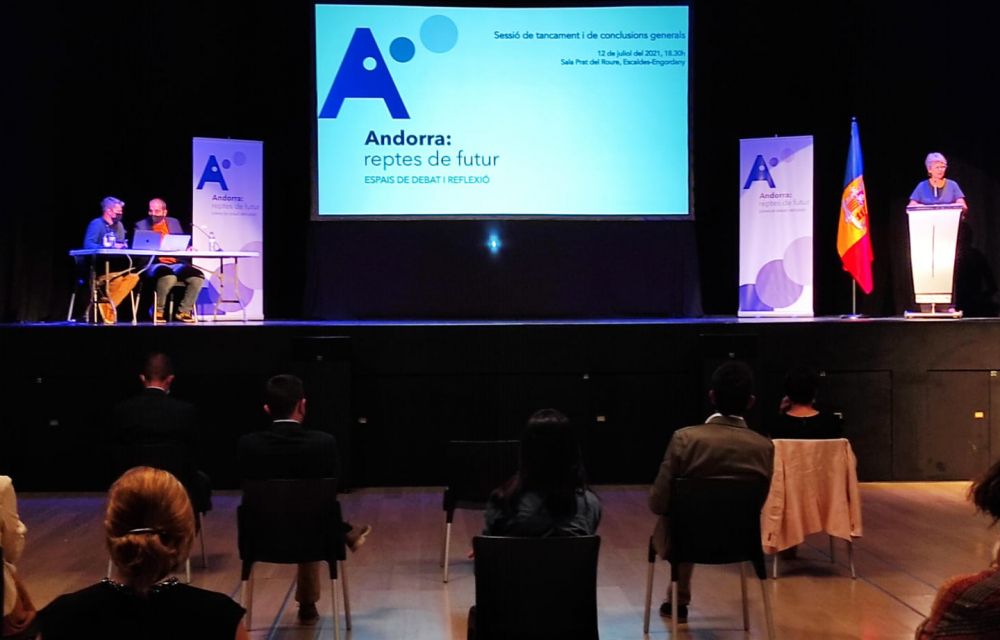 La sala d’actes del Prat del Roure ha acollit aquesta tarda la sessió de tancament i d’anunci de les conclusions derivades dels cinc gran eixos o taules en què, en conjunt, han participat 110 persones encapçalades per una vintena llarga de representants procedents del Consell General, vint més de Govern, vint més dels comuns, tretze de parapúbliques o societats participades i encara no una trentena de persones procedents de la societat civil, organitzada o no (tres persones en aquest darrer cas).