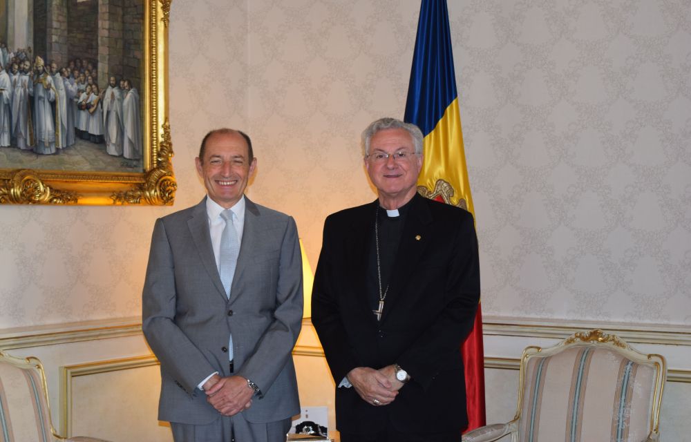 Joan-Enric Vives ha rebut aquest matí la visita institucional de l’històric director del gabinet del representant del Copríncep francès. Pascal Escande s’acomiadava del cap d’Estat després que deixarà el seu càrrec per jubilació en les properes setmanes. A la trobada, que s’ha dut a terme al palau episcopal, en un to molt cordial, hi han estat presents el representant del Copríncep episcopal, Josep Maria Mauri; l’adjunt al representant, Eduard Ibáñez, i la secretària general del Copríncep, Conxita Garcia Moyano.