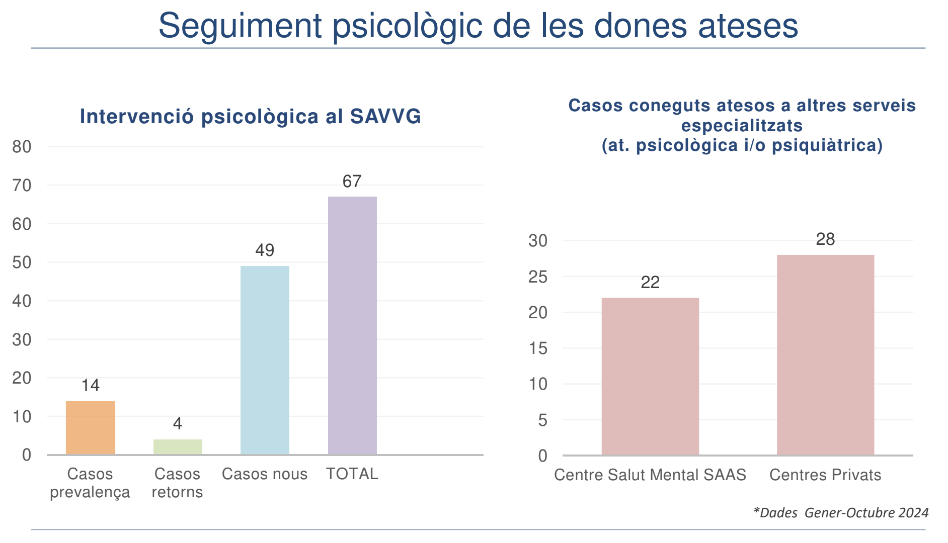 També s’ha destacat que un 70% de les ateses no han tornat amb la parella, però un 19% sí, 19 dones han rebut acompanyament jurídic a nivell civil i 19 més, a nivell penal; mentre que 67 han volgut seguiment psicològic.