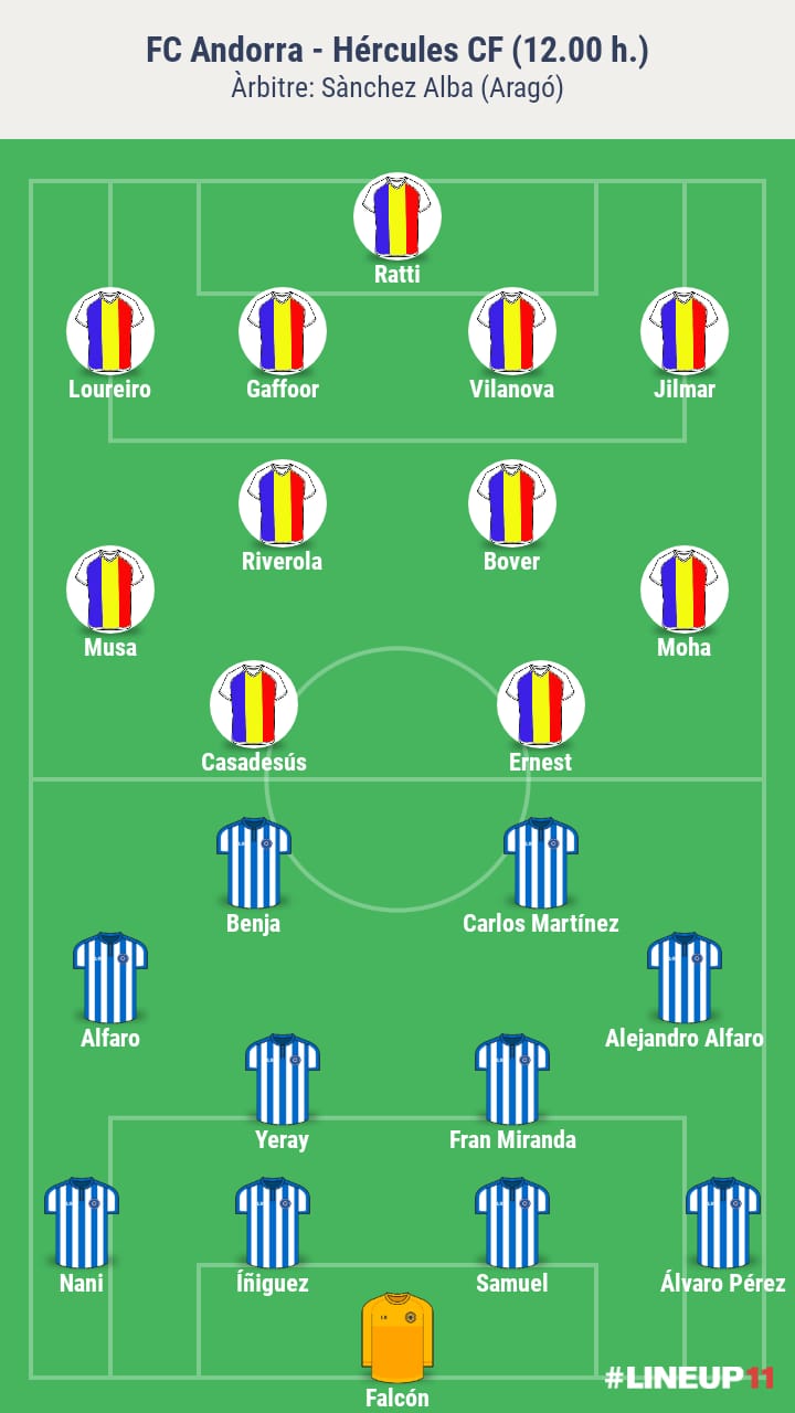Pel que fa a l'Hércules, tot apunta que Jesús Muñoz repetirà un equip similar o gairebé el mateix onze que la setmana passada. El bon joc i l'encara millor resultat obtingut contra el filial blaugrana fa pensar que no tocarà gaire cosa de l'equip. El tècnic no pot comptar ni amb Felipe, per lesió, ni amb Alvarado, convocat amb la selecció sub 23 de Colòmbia. L'entrenador ha elogiat els números defensius de l'Andorra, al mateix temps que ha destacat que tenen un joc similar al del Barcelona, ja que Gabri "ha sortit d'aquella casa i té el seu ADN". També ha destacat el fet d'haver de jugar sobre gespa artificial, superfície a la qual no estan acostumats, tot i que assegura que "anem amb la mentalitat de ser un equip competitiu".
