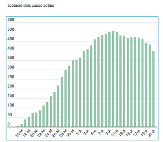 Altres dues estadístiques que varien de forma positiva són la de casos actius i la de curats. En aquest darrer cas, ja són 282 mentre que, en el primer, s’ha baixat de la barrera dels 400, fins a 398.