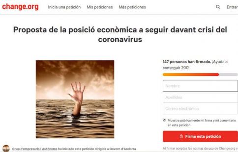 La petició està dirigida al Govern i ha estat impulsada per un Grup d’Empresaris i Autònoms que, assegura, compta per ara amb el suport de 358 persones i de 40 empreses. Com a motivació, remarquen que la crisi sanitària comportarà també una d’econòmica i que “existeix una incertesa completa de la situació a Andorra”, tant l’actual com la que hi haurà un cop se superi la pandèmia.