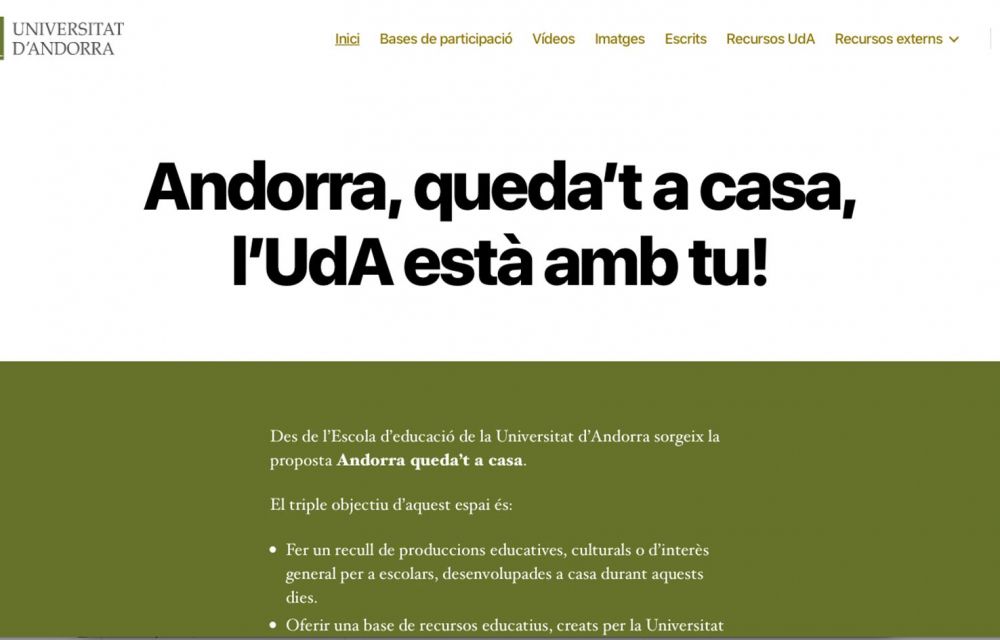 L’espai, andorraquedatacasa.uda.ad, té la voluntat d’aglutinar materials que les famílies puguin desenvolupar a casa, recursos educatius creats per la Universitat d’Andorra i, en especial, pels estudiants del bàtxelor en Ciències de l’educació, i d’altres recursos externs d’interès que s’han anat recopilant. Tot plegat amb l’objectiu de reforçar la consigna de quedar-se a casa, de promoure la creativitat de la població i d’incentivar que es comparteixin experiències i coneixements amb els infants.