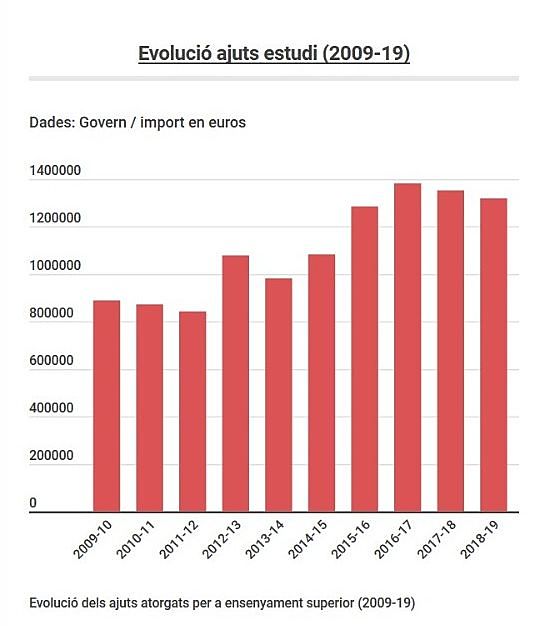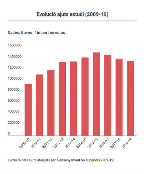 Aquesta tendència a la baixa va iniciar-se, doncs, a partir del 2016. Fins llavors, els imports atorgats havien anat experimentant any rere any pujades, segons es reflecteix a les dades. En global, entre el curs 2009-10 i el darrer, el total d’ajuts concedits pel ministeri d’Educació ascendeix a 13,1 milions d’euros.