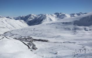 Una vista del Pas de la Casa amb tot l'entorn de pistes ben nevades.