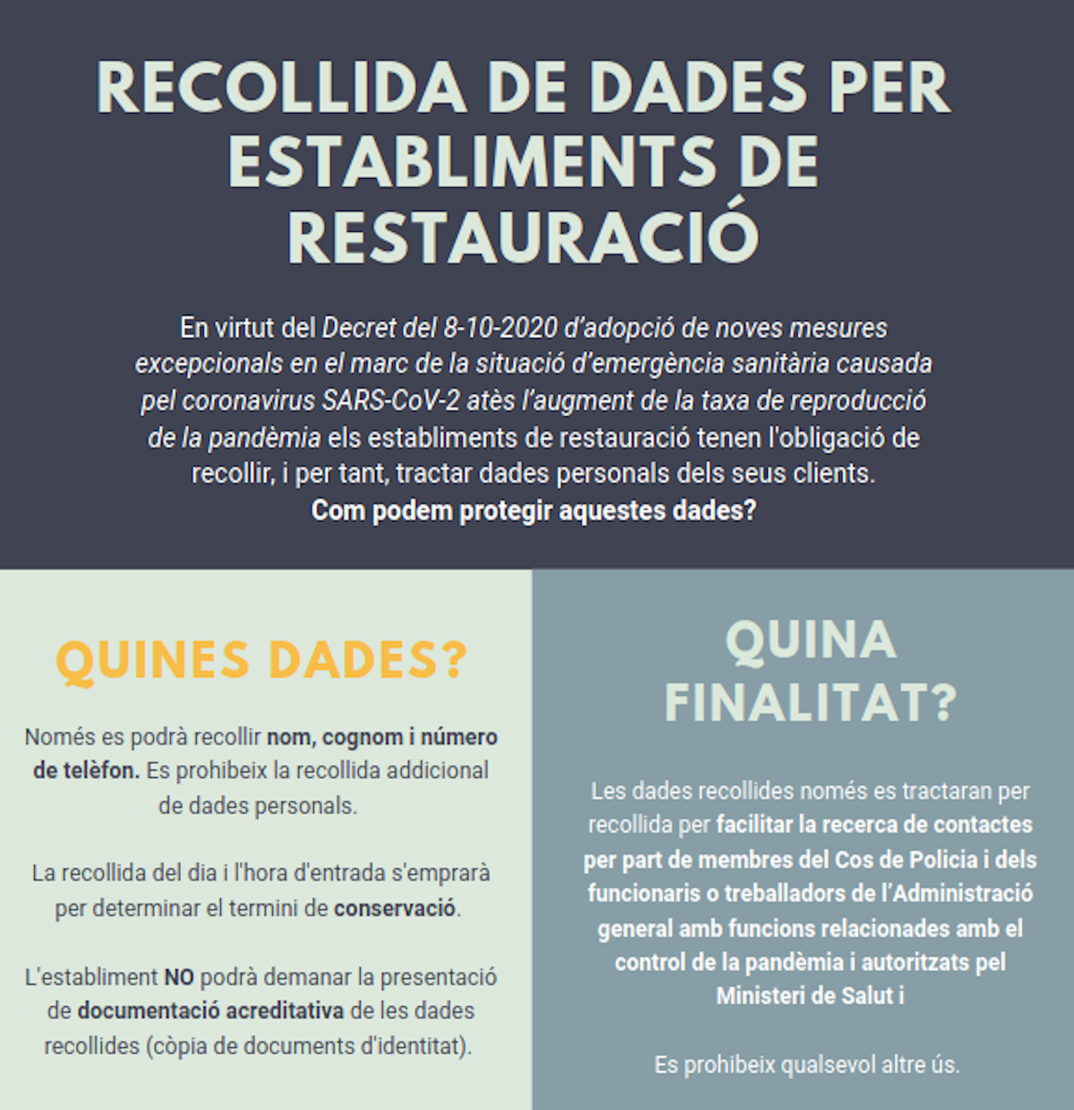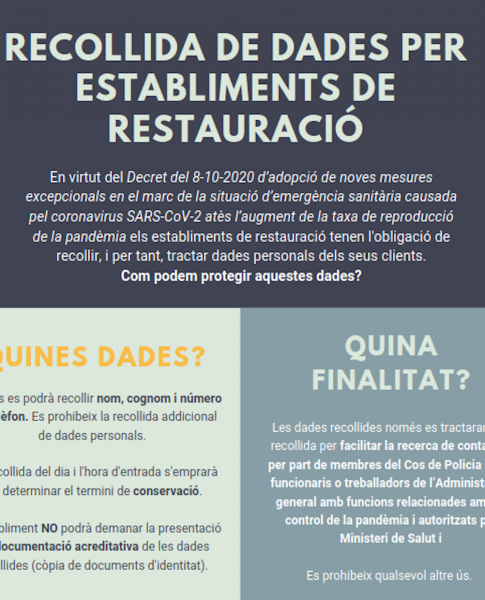 Podeu trobar a la nostra plana web un infogràfic relatiu a la recollida de dades de contacte de clients en establiments de restauració per a facilitar la recerca de contactes arran de la crisi de la COVID-19.