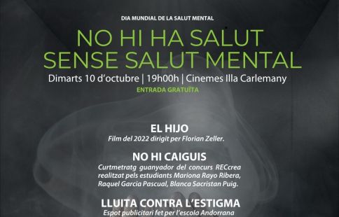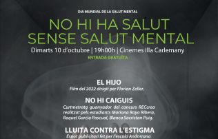 En aquest cas, a més de poder-se veure el film ‘El hijo’, de Florian Zeller i que justament tracta la impotència d’un pare davant la depressió que pateix el seu fill adolescent, els assistents també podran gaudir del curtmetratge ‘No hi caiguis, guanyador del concurs RECcrea, realitzat pels estudiants Mariona Rayo Ribera, Raquel Garcia Pascual i Blanca Sacristan Puig, a més de l’espot publicitari elaborat per alumnes de batxillerat de l’escola andorrana que porta per títol ‘Lluita contra l’estigma’.