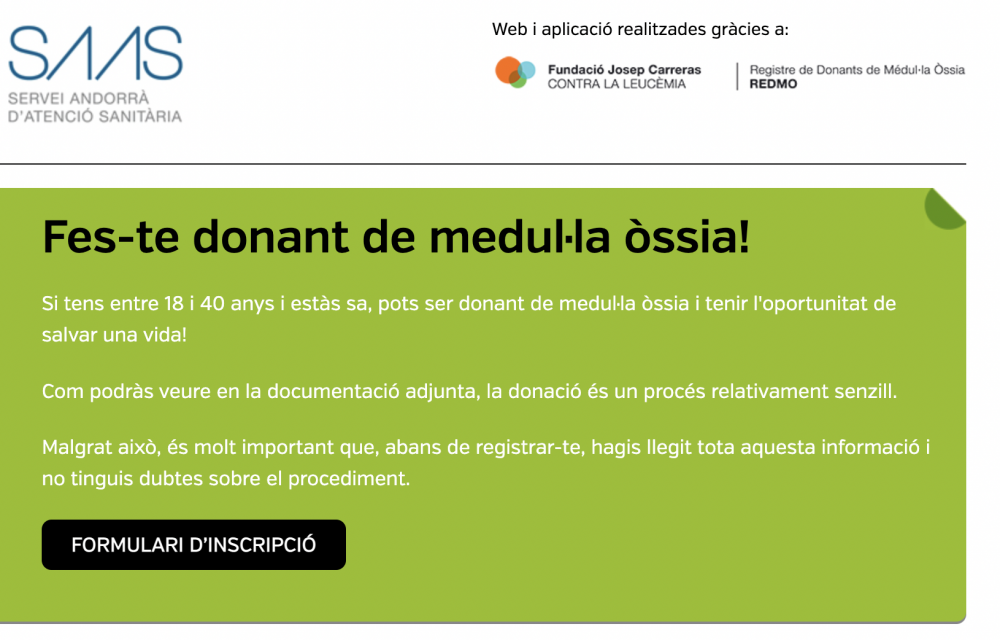 Les dades s’han publicitat arran de la celebració, aquest dissabte, del Dia Mundial del Donant de Medul·la Òssia, que se celebra cada tercer dissabte de setembre. De fet, al Registre de Donants de Medul·la Òssia (REDMO) del Principat hores d’ara hi ha un total de 371 inscrits. Però hi ha tres persones que estan pendents per fer-se el tipatge. Les inscripcions es poden fer directament a través de la pàgina web establerta a l'efecte i, a més a més, es fan campanyes específiques de captació amb força èxit durant els dies de col·lecta de sang.