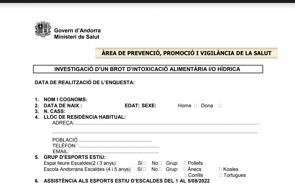 Salut exposava que com que els àpats del Calones procedeixen d’una cuina central que té més clients, caldria fer una enquesta àmplia. La sorpresa dels pares dels infants dels Esports d’Estiu d’Escaldes s’ha donat les darreres hores quan des de la secretaria d’Esports del comú s’ha tramès un document del ministeri de Salut amb una enquesta específica sobre l’esmentat servei i l’eventual intoxicació alimentària o hídrica. A més, es demanava una resposta ràpida.