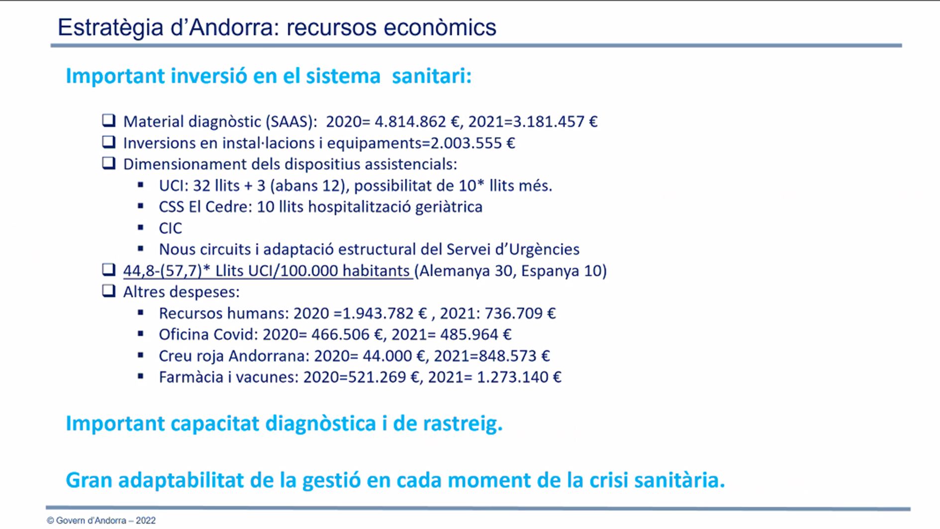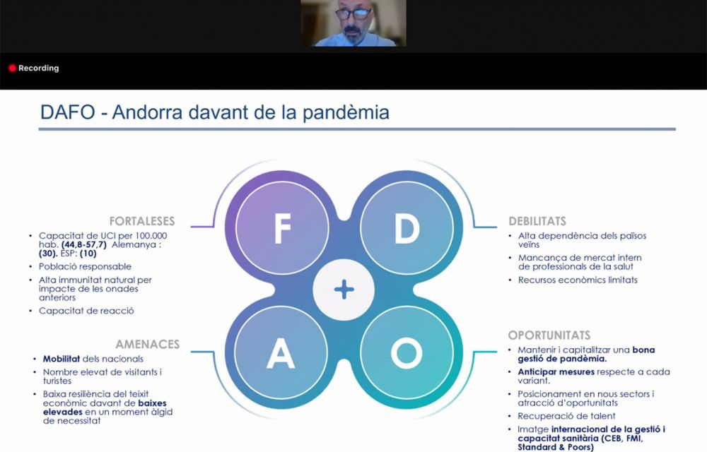 Tots plegats, que han lloat la posada en marxa de la secció andorrana de la SCB, han ressaltat les dificultats i les virtuts de la gestió de la pandèmia. També Martínez Benazet ha exposat les debilitats i les fortaleses del Principat en relació amb la crisi sanitària. De fet, ha explicat en el webinar molts dels elements que detalla en les seves reiterades compareixences públiques que protagonitza. De forma segregada, ha informat que s’han destinat 16.319.817 euros a la gestió sanitària directa per fer front a la Covid, essent la partida més gran la invertida en material diagnòstic (TMA, antígens, tests serològics…), en total 7.996.319, i destinant una mica més del 10% del global (1.794.409 euros) a fàrmacs i vacunes.