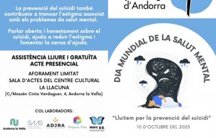 Una ponència del cap del servei de Salut Mental del SAAS, el psiquiatra Carlos Mur, i xerrades de la presidenta de l’Associació en Defensa del Jovent en Risc d’Andorra, Sandra Cano; de la presidenta de l’associació Projecte Vida, Eva Tenorio; i de les integrants de l’associació d’Ajuda Mútua davant la Pèrdua Marc GG Rosa Galobardes i Neus Mallol centraran la jornada, que anirà de les 10 del matí a les 2 de la tarda.