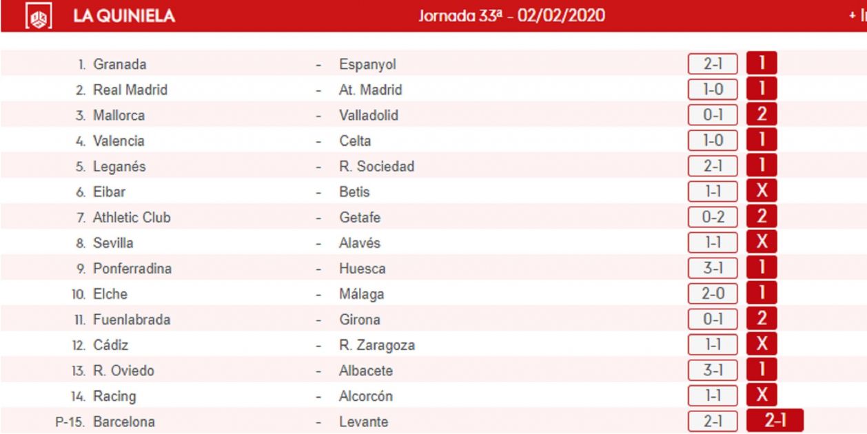 Malgrat que oficialment la màquina que segella les travesses, i altres productes de la Loteria nacional espanyola, està domiciliada a Montferrer, fonts de l’establiment escaldenc han confirmat que va ser en el seu local, al Passeig Valira, on es va dipositar la butlleta que ha estat premiada. La de la clienta habitual de ‘Cal Tavi’ ha estat l’única travessa amb 14 encerts en la jornada 33. La travessa d’aquest cap de setmana contenia set 1, quatre empats (X) i tres 2. Com s’ha dit, el partit designat com del Ple al 15, en aquesta ocasió el Barça-Llevant, no només cal dir si hi haurà victòria local o forana o empat. Cal encertar el resultat. Els blaugrana van vèncer per 2 gols a 1.