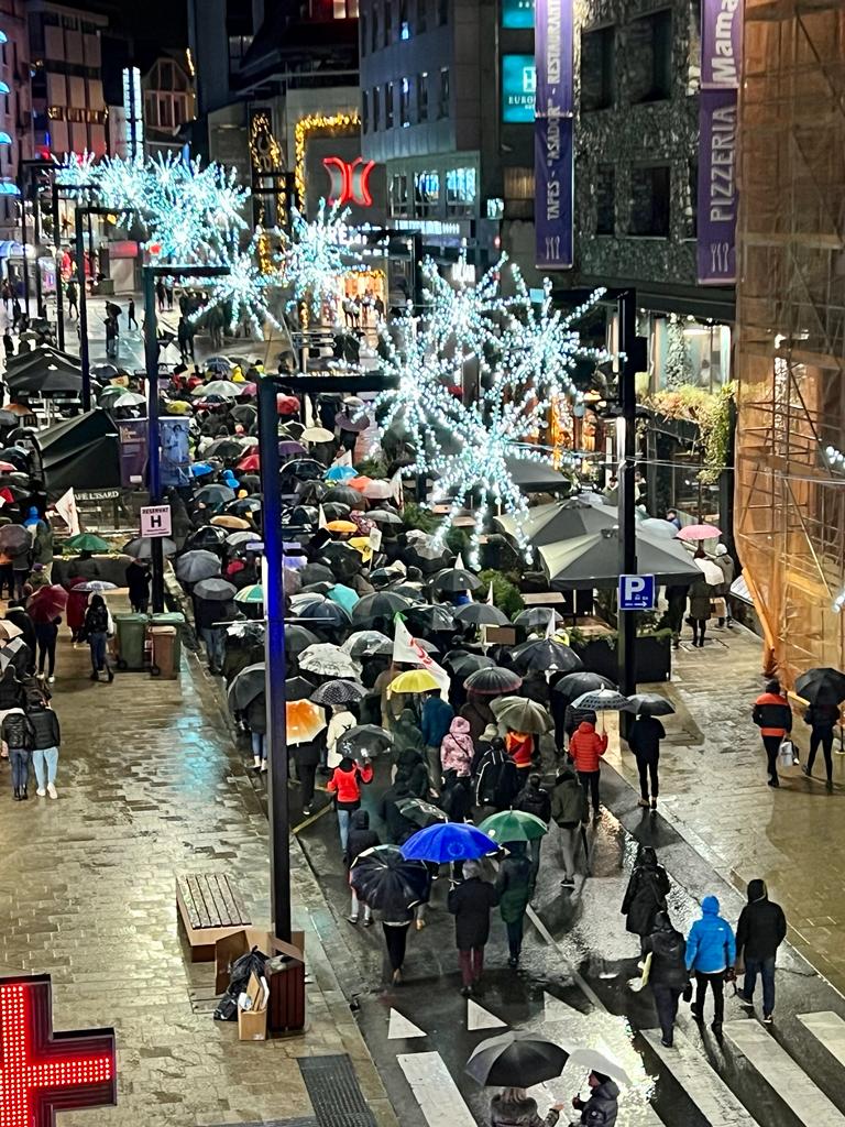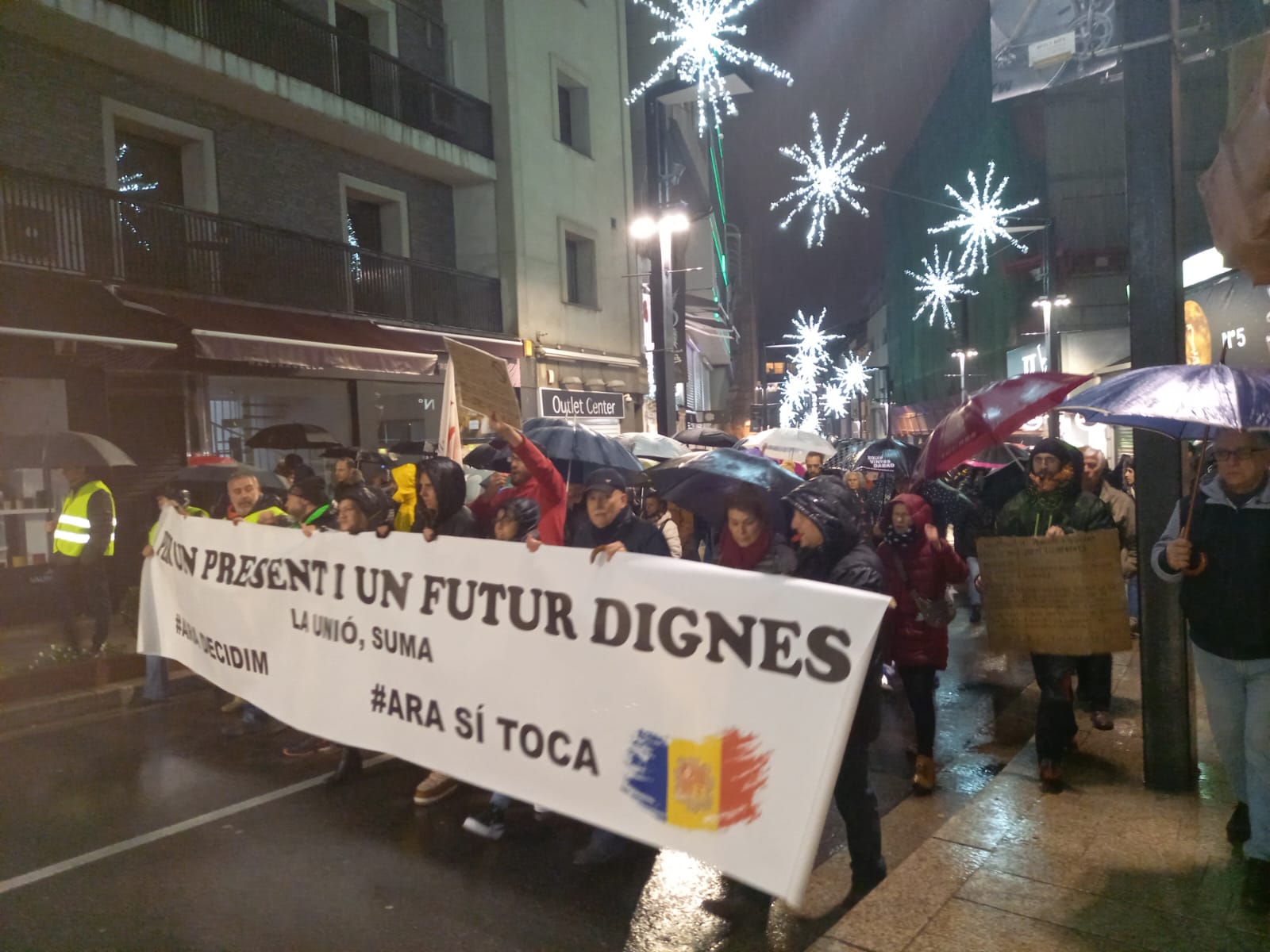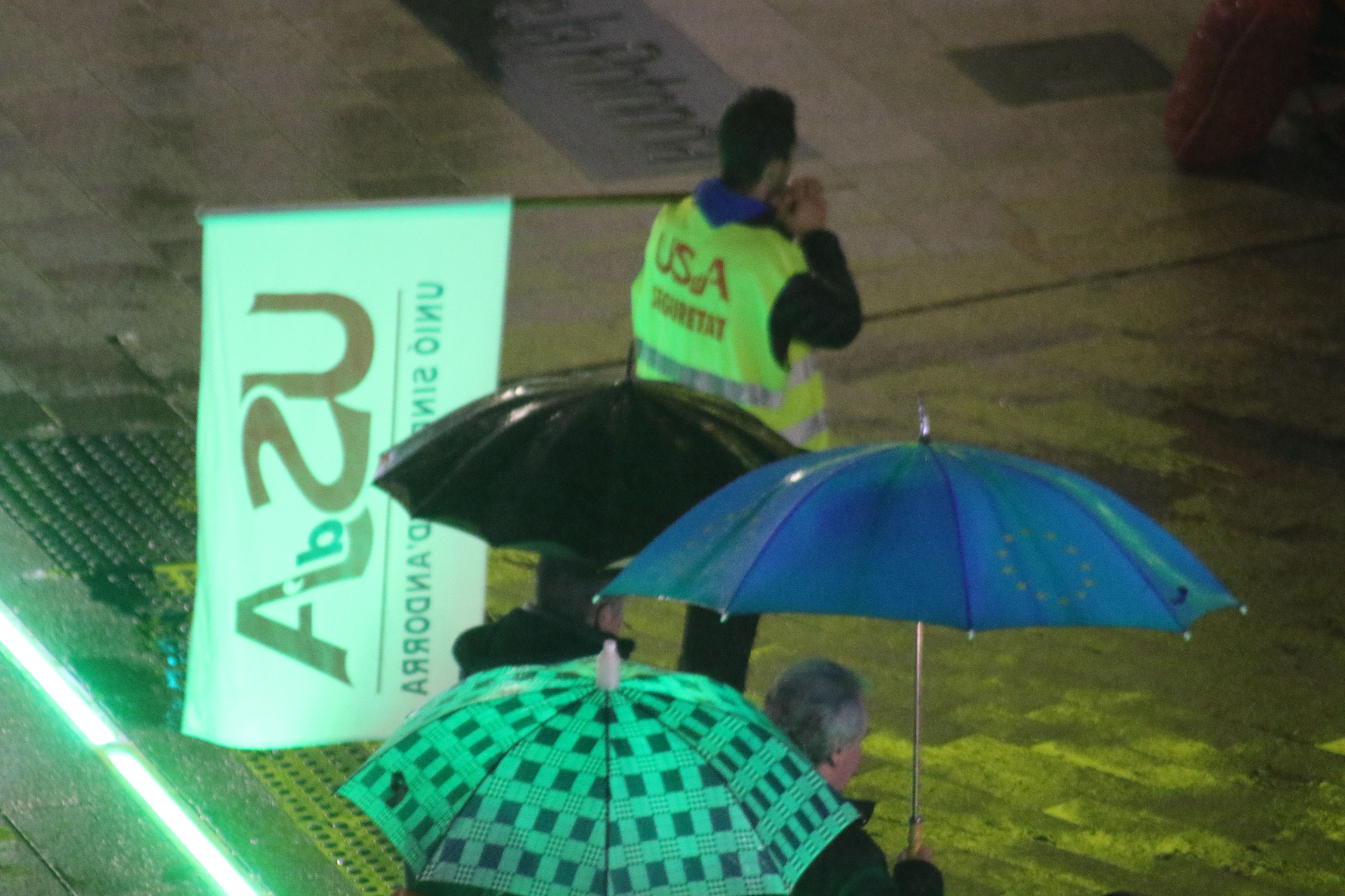 Cert, a l’inici de la manifestació, a la plaça Coprínceps, la imatge era força desencoratjadora. Tot just dos centenars de persones han iniciat el recorregut, evidenciant llavors que la ciutadania andorrana no es mulla per molt malament que estiguin les coses. Xiulets, consignes diverses i molta puntualitat i paraigües, això sí, es deixen notar per l’avinguda Carlemany i, posteriorment, per Meritxell. I segons avançava la marxa cap al destí final, la plaça Guillemó, s’hi ha anat afegint gent. Al final, les xifres han millorat. Fins a 400, segons els urbans de la capital, i entre 550 i 700, des dels sindicats.