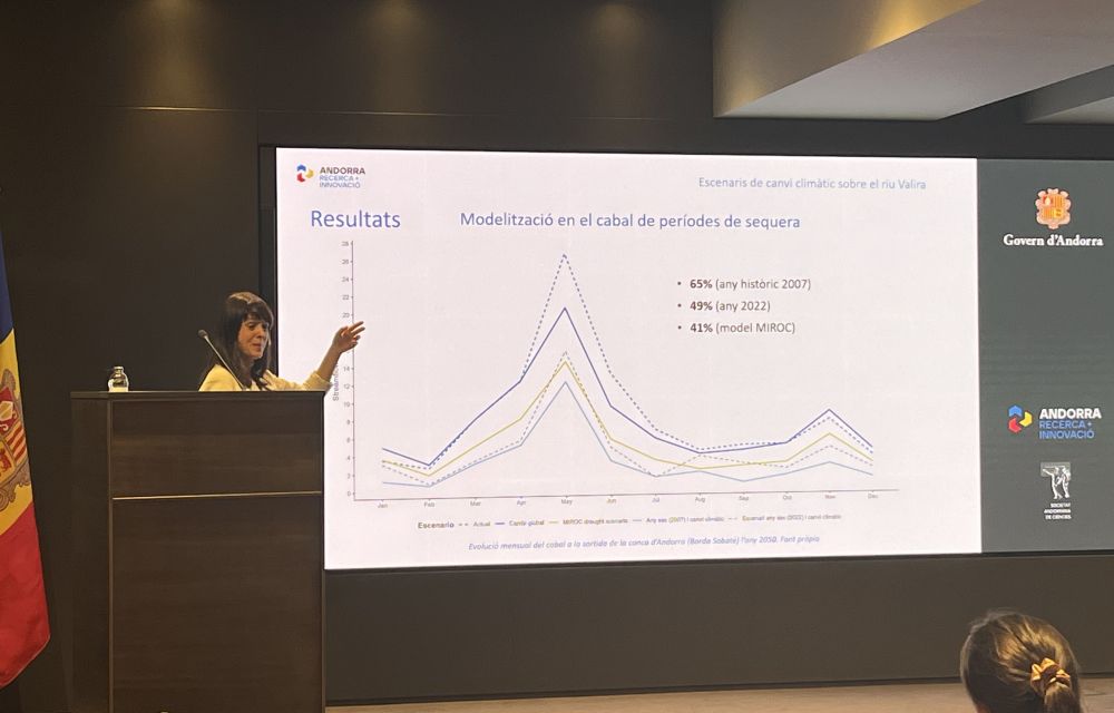 La investigadora d’Andorra Recerca + Innovació i experta en boscos per la Universitat de Lleida, Marta Domènech, ha exposat quins efectes tindrà el canvi climàtic sobre el riu Valira, on segons els estudis que estan realitzant, l’escenari actual mostra que el cabal segons el període de referència -on l’augment de la temperatura és moderat- disminuirà en les èpoques de primavera i estiu, però que amb l’avançament del desgel “sembla que podem arribar a tenir una mica més de recurs hídric a les èpoques hivernals”, ha explicat.