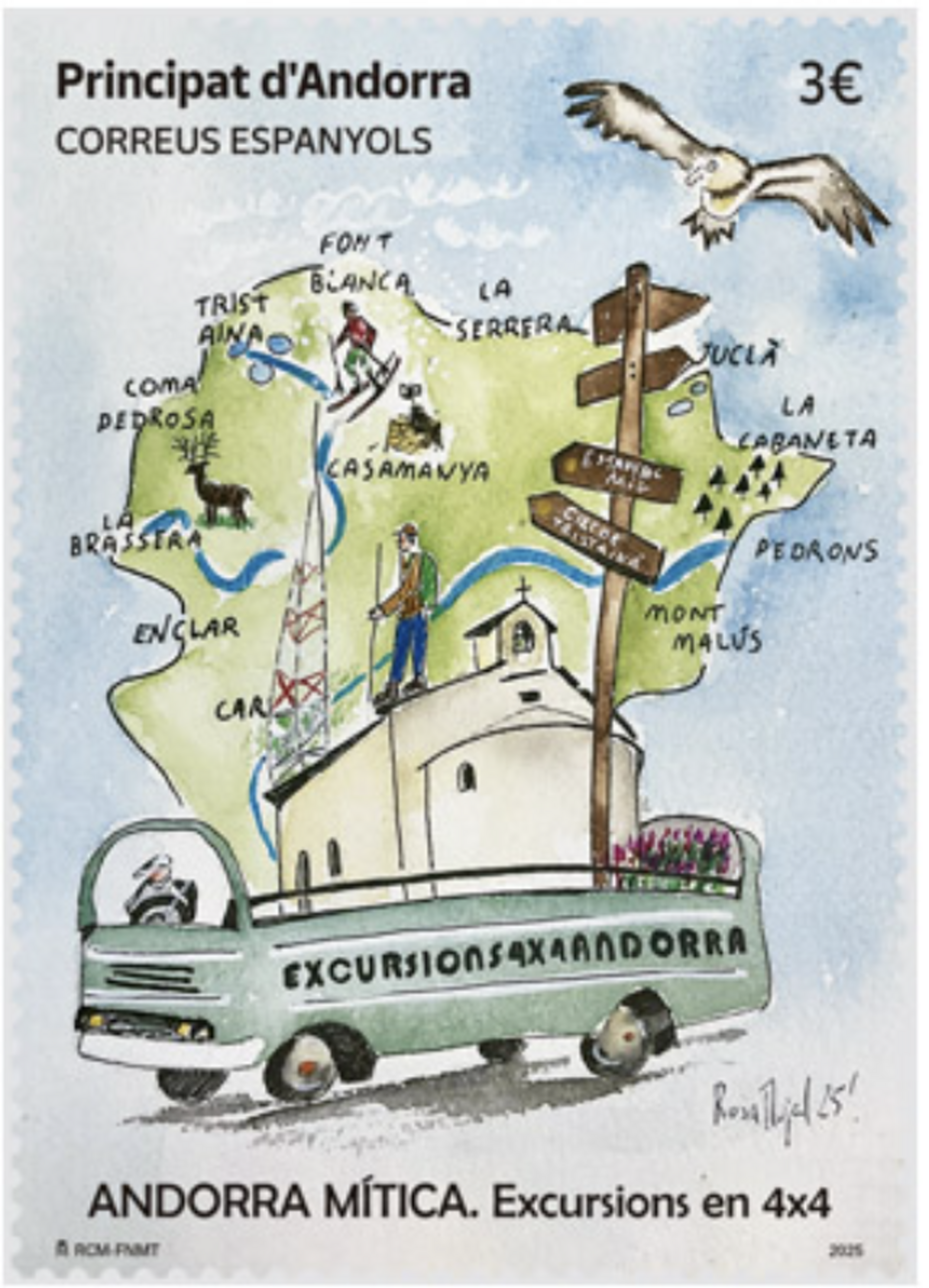 Es tracta d’empreses com Excursions Lito, Excursions Baró, Excursions Font o Excursions Coll, que comptaven amb flotes de vehicles col·lectius modificats per transportar turistes a la muntanya com si fos un safari. Autobusos amb sostres serrats, vehicles tot-terreny descapotats i amb bancs instal·lats als espais del maleter, pintats de colors vius i retolats amb el nom de les seves empreses eren alguns dels vehicles que van circular pel territori aquelles dècades i que ara surten en el segell.