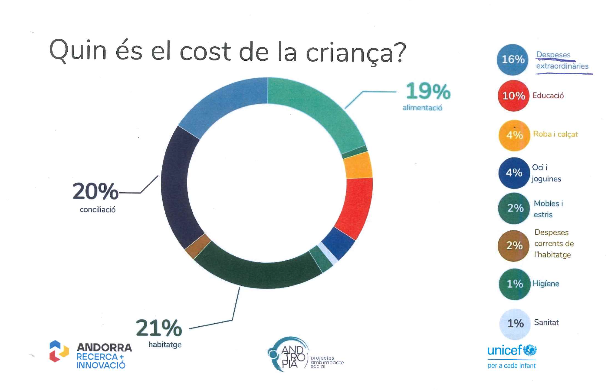 L’estudi és fruit de la col·laboració entre Andorra Recerca+Innovació (AR+I), Andtropia i Unicef. El treball actualitza el que ja es va fer fa dos anys i evidencia que tenir fills suposa una càrrega molt important per a les economies familiars. Una càrrega que, a més, s’ha incrementat en aquests dos anys. Així, de mitjana, el cost per criar un menor al país se situa en 802 euros. La dada suposa un increment del 9% en aquests dos anys, però també depèn de l’edat de l’infant.