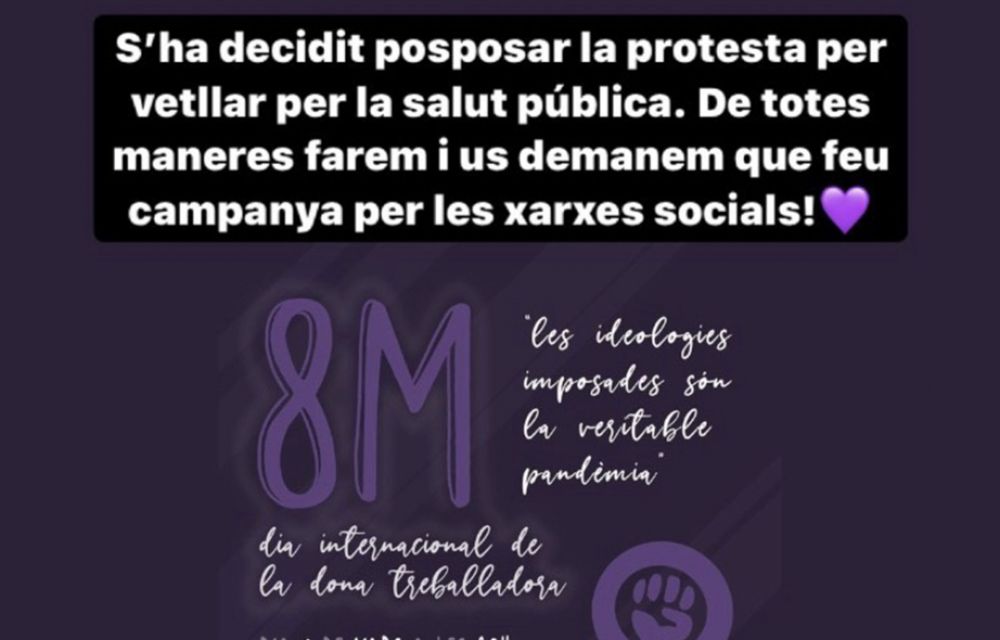 No obstant, i en el mateix moment que anuncien que posposen, com a sinònim de suspensió, l’acte, demanen també als seus col·laboradors que facin difusió de les vindicacions del col·lectiu en l’àmbit del feminisme a través de les xarxes. Contracorrent posava sobre la taula com a eslògan ‘Les ideologies imposades són la veritable pandèmia’.